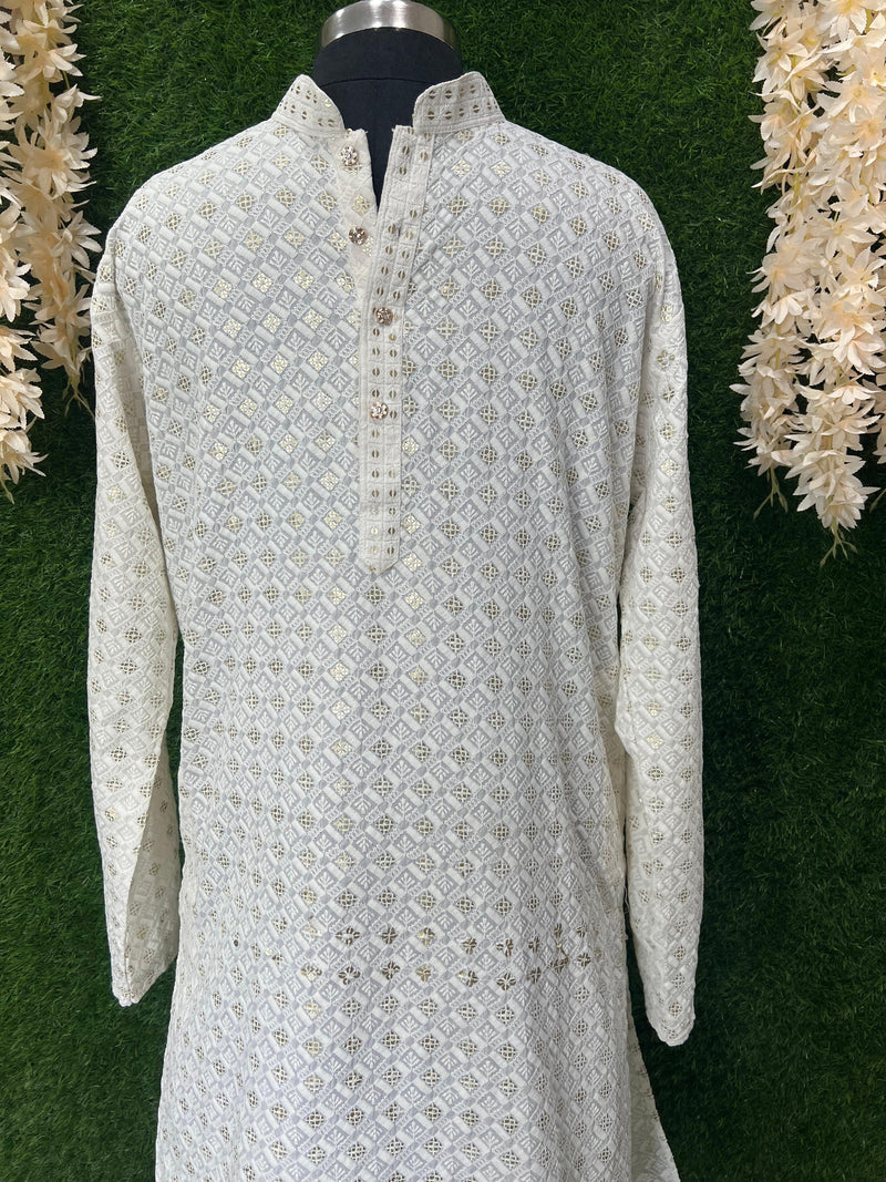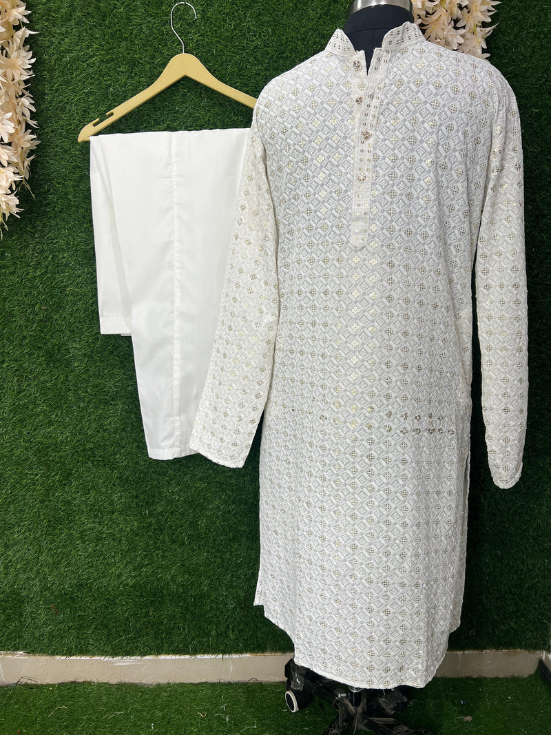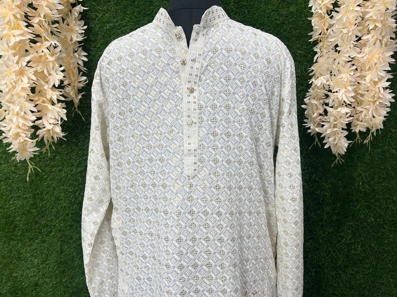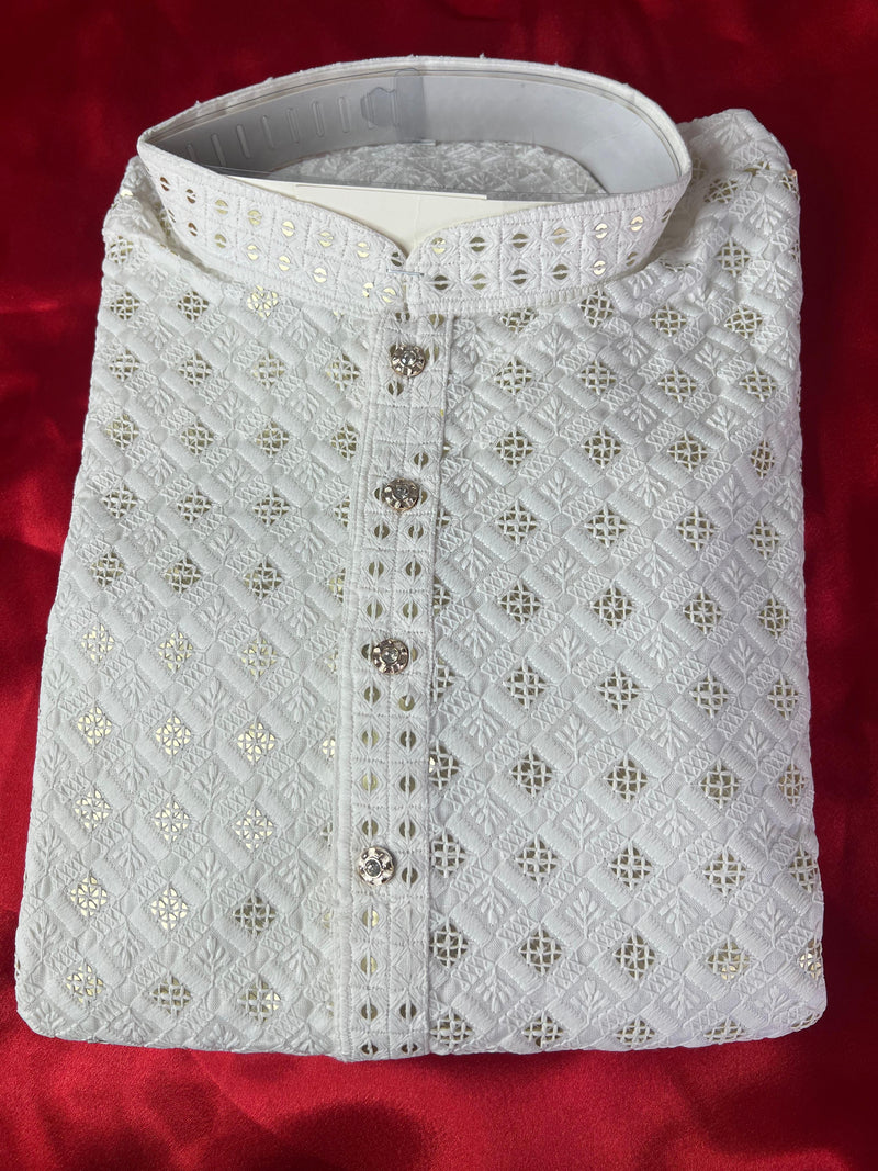 • Make a statement at every occasion with this men’s kurta set, beautifully detailed with shimmering sequin work for a touch of festive glamour.