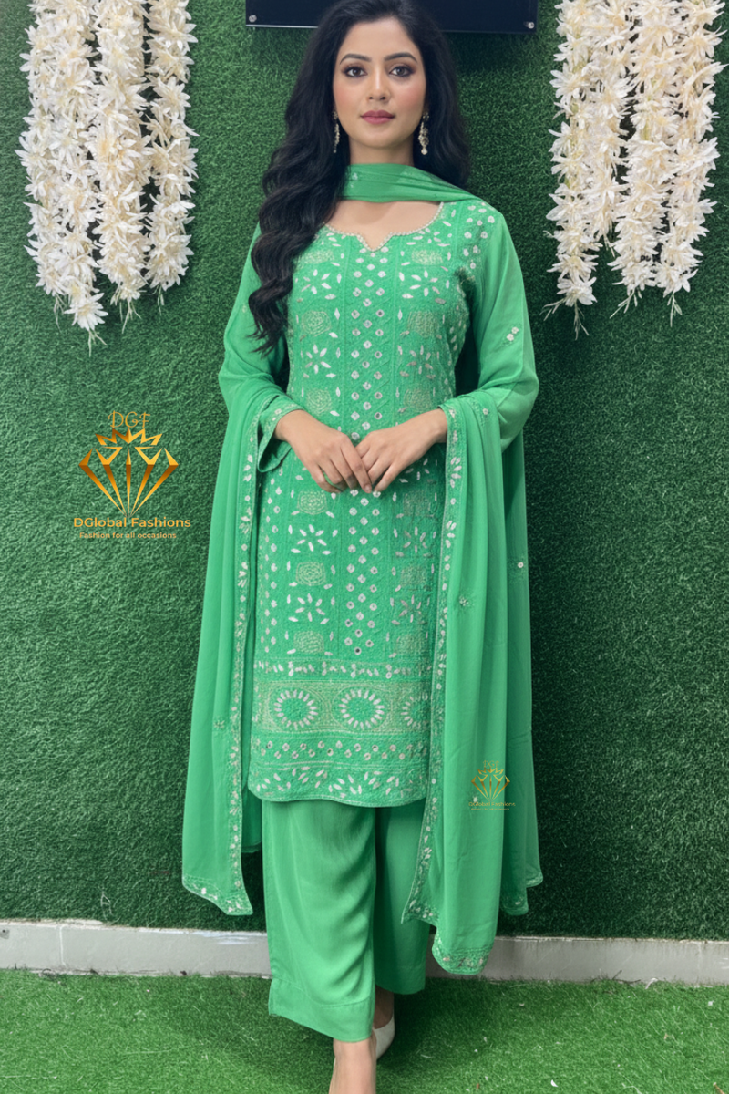 Make a stunning statement with this beautiful green Lucknowi chikankari suit set, adorned with intricate hand embroidery, real mirror embellishments, and delicate gota work. The set includes a straight kurta with fine detailing, matching pants, and a graceful dupatta
