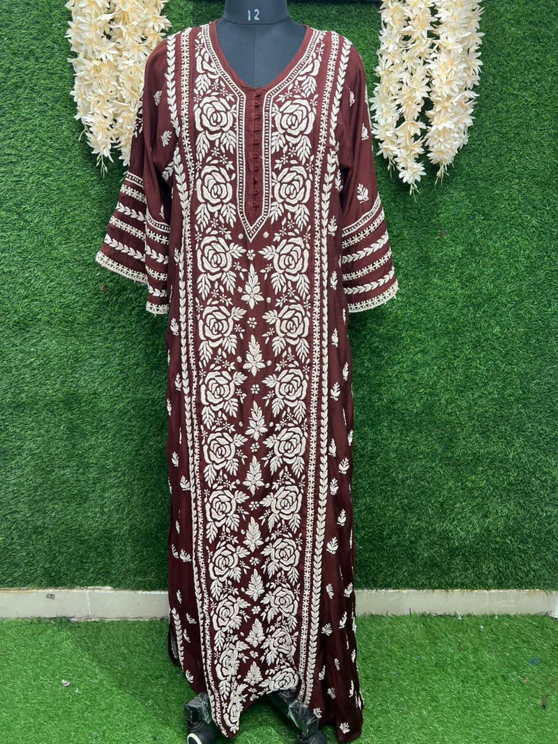 Beautiful maharani long kurti crafted in soft, featuring detailed chikankari-style embroidery and elegant full lace work.
