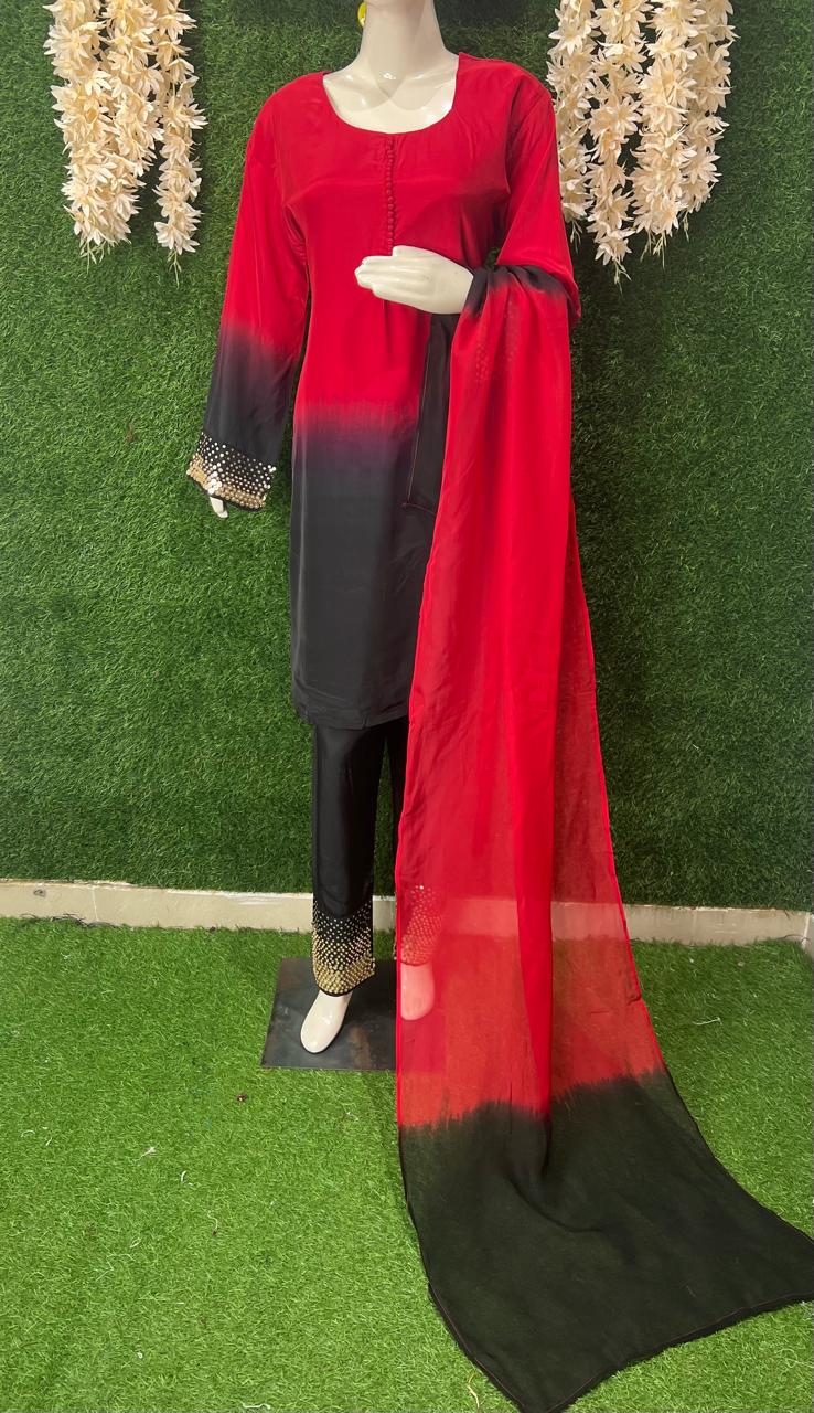 Elegant ombre kurti pant set beautifully detailed with sequin handwork on sleeves and pant hem. Paired with a soft matching dupatta, perfect for festive functions, parties, and stylish ethnic looks.