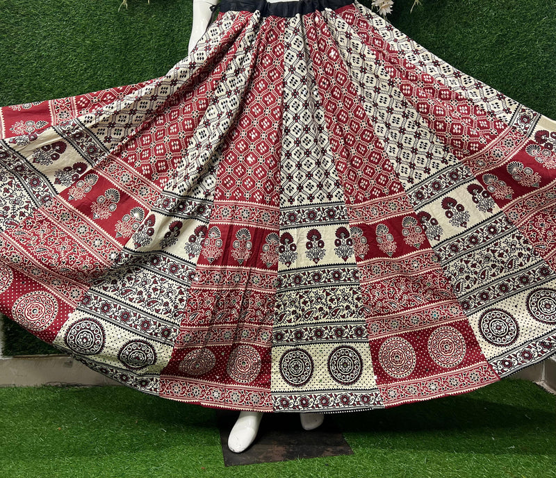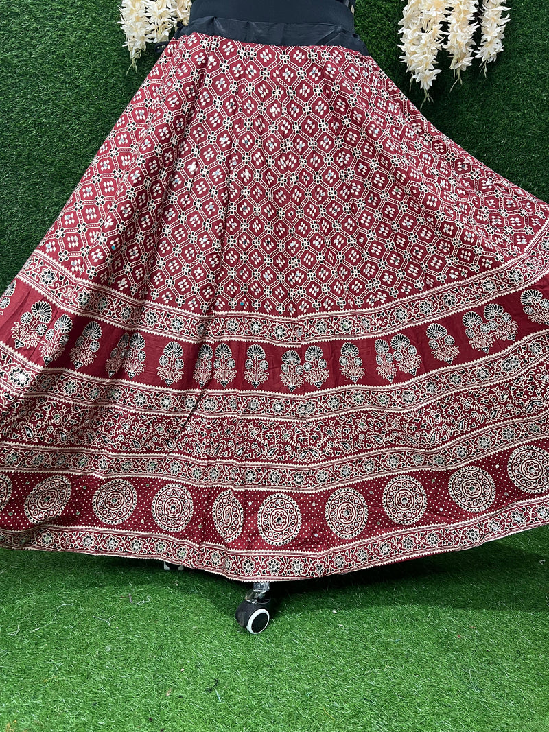 Elevate your ethnic wardrobe with this beautifully crafted Ajrakh skirt. Featuring traditional block prints and delicate mirror detailing, this skirt blends timeless artistry with a modern flair. Ideal for festive occasions, casual gatherings, or a statement everyday look.