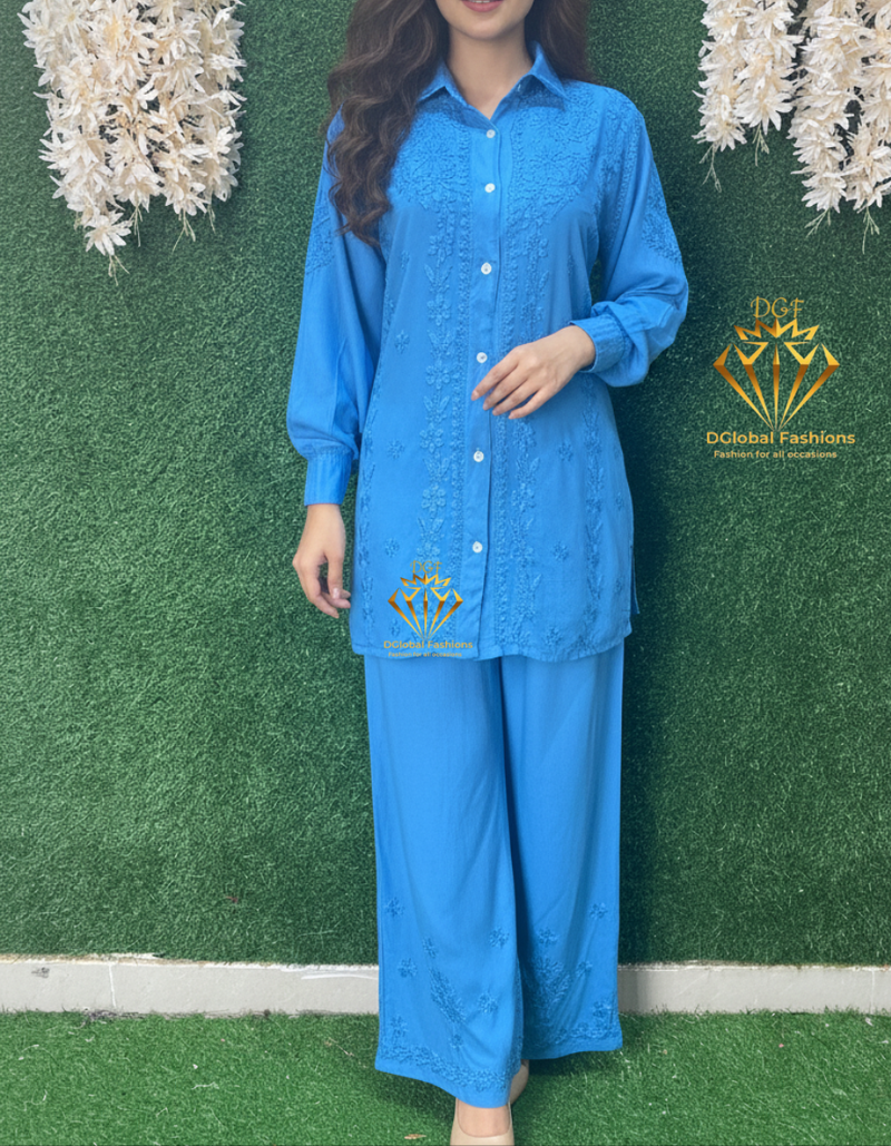 Step into timeless elegance with this Lucknowi Chikankari handwork co-ord set crafted in soft, breathable rayon fabric. The shirt features intricate hand-embroidered Chikankari motifs, showcasing delicate artistry from Lucknow, while the matching bottoms complete a chic, coordinated look
