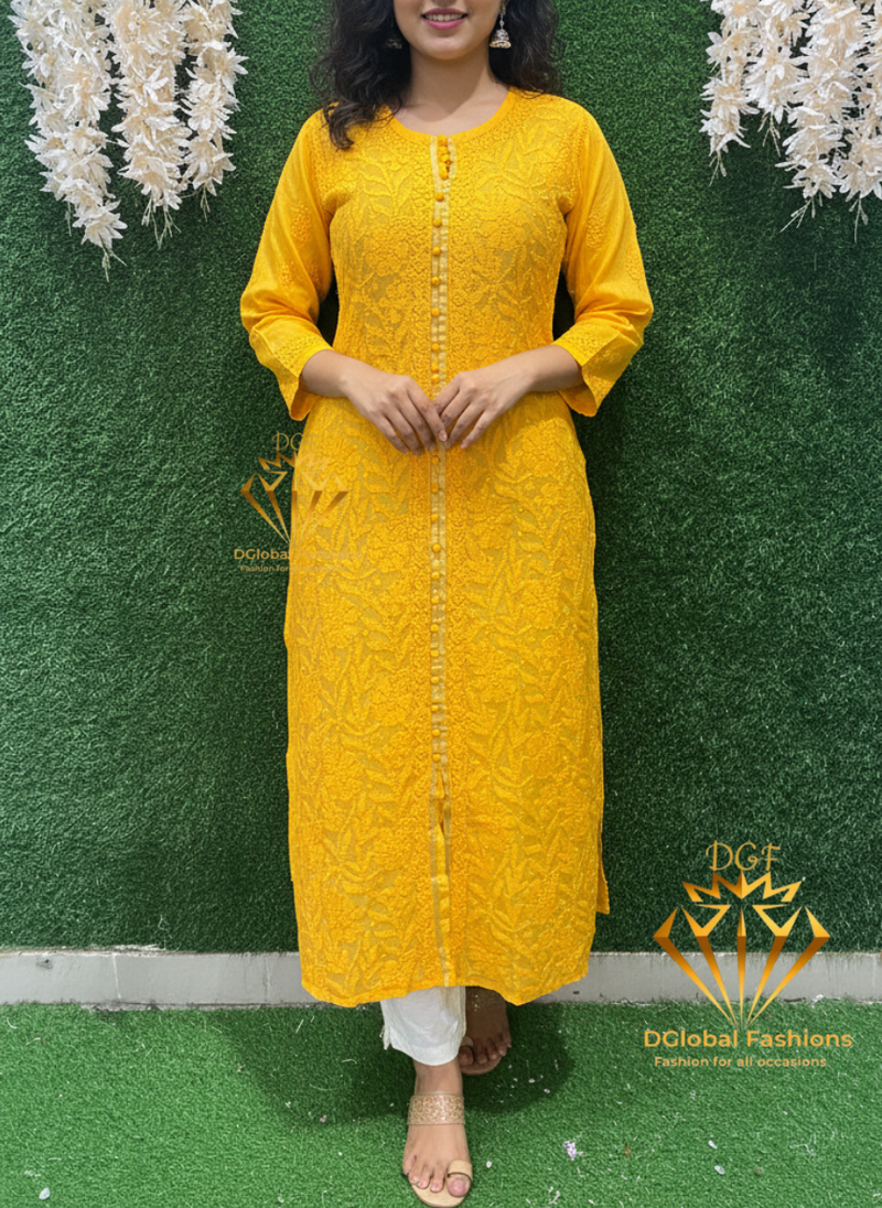 Make a statement in this stunning Lucknowi Chikankari chanderi long kurti, exquisitely crafted with intricate full hand embroidery. Designed with detailed floral patterns and a front button-down style, this kurti beautifully combines traditional artistry with modern elegance.