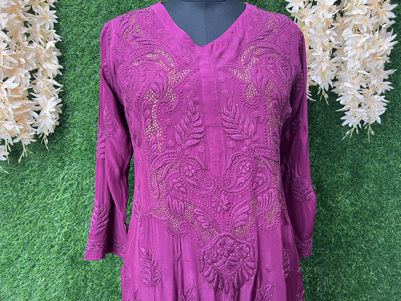 Elevate your ethnic wardrobe with this exquisite Crepe Kurti, beautifully adorned with intricate Lucknowi Chikankari embroidery and traditional Mukesh (Mukaish) work. Designed with fine detailing and delicate patterns, this kurti blends timeless craftsmanship with graceful style.
