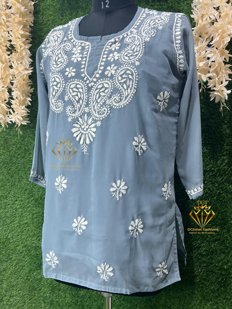 This beautiful Chikankari Georgette short top, intricately hand-embroidered with delicate floral and paisley patterns. Perfect for casual outings or festive gatherings, this lightweight georgette top offers effortless elegance and comfort.